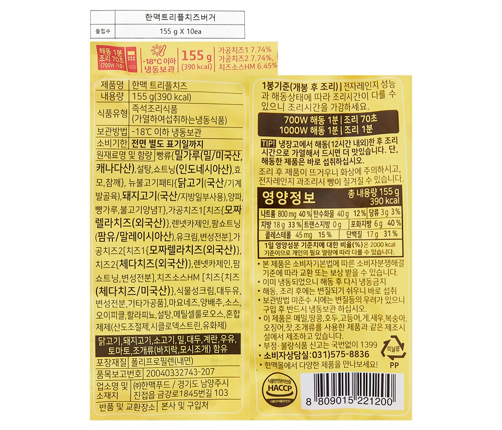 | 포장단위별 내용물의 용량(중량), 수량 | 155g*10개 | 원재료명 및 함량 | 컨텐츠 참조 |