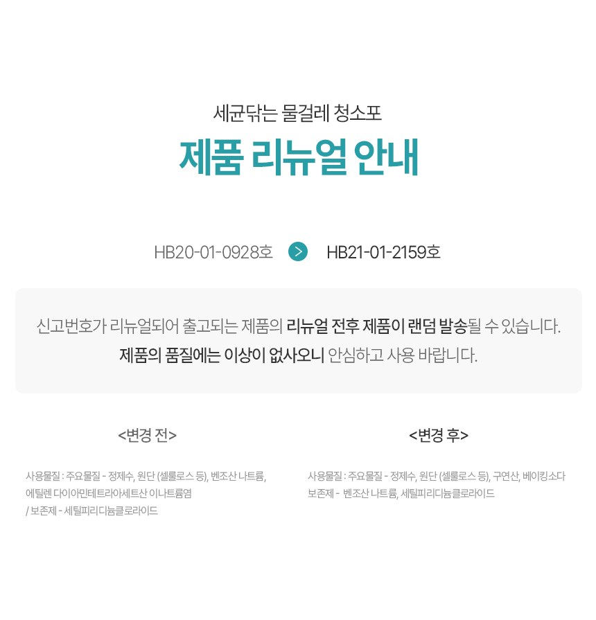 | 품목 및 제품명 | 세정제,살균제 / 기본에 세균닦는 물걸레청소포 | 용도(표백제의 경우 계열을 함께표시) 및 제형 | 일반용-건물 바닥용-,일반용-일반물체용 / 비분사형-티슈형 |