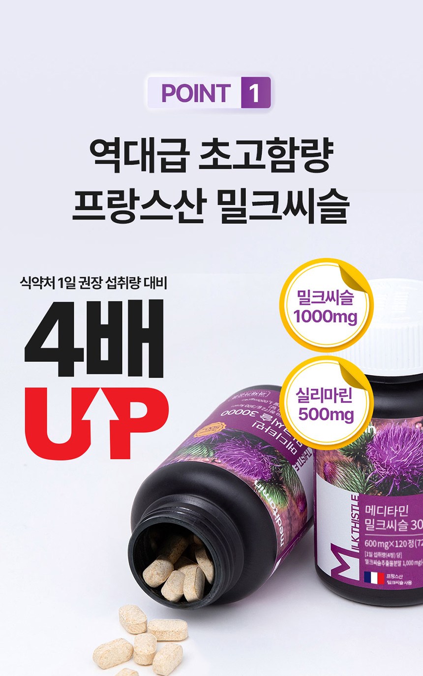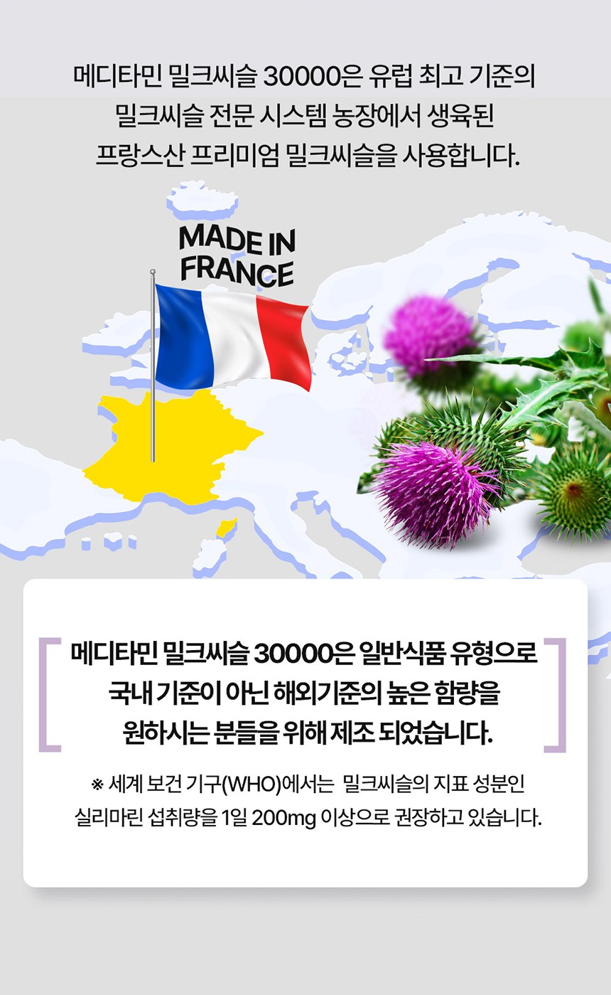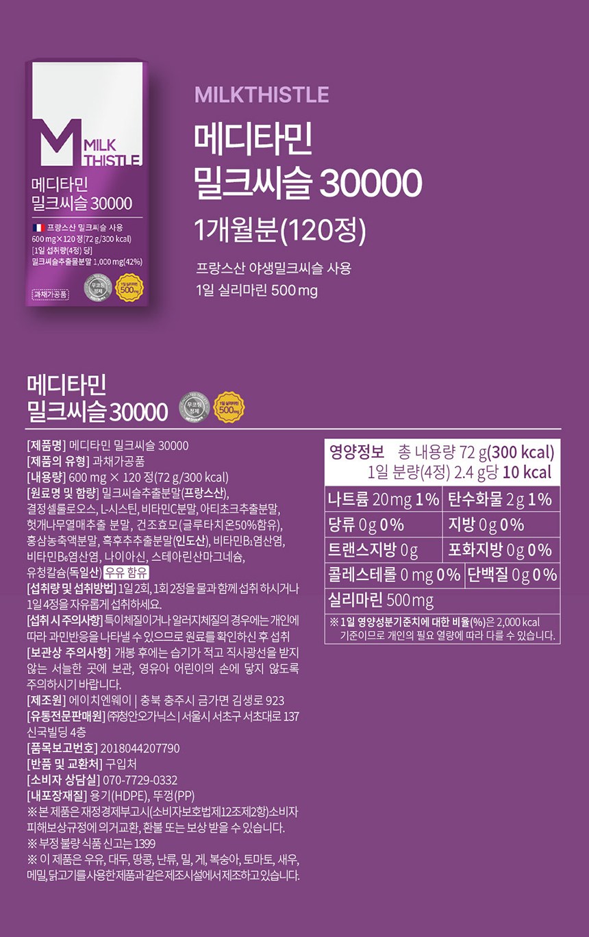 | 제품명 | 메디타민 밀크씨슬 30000 | 식품의 유형 | 과채과공품 |