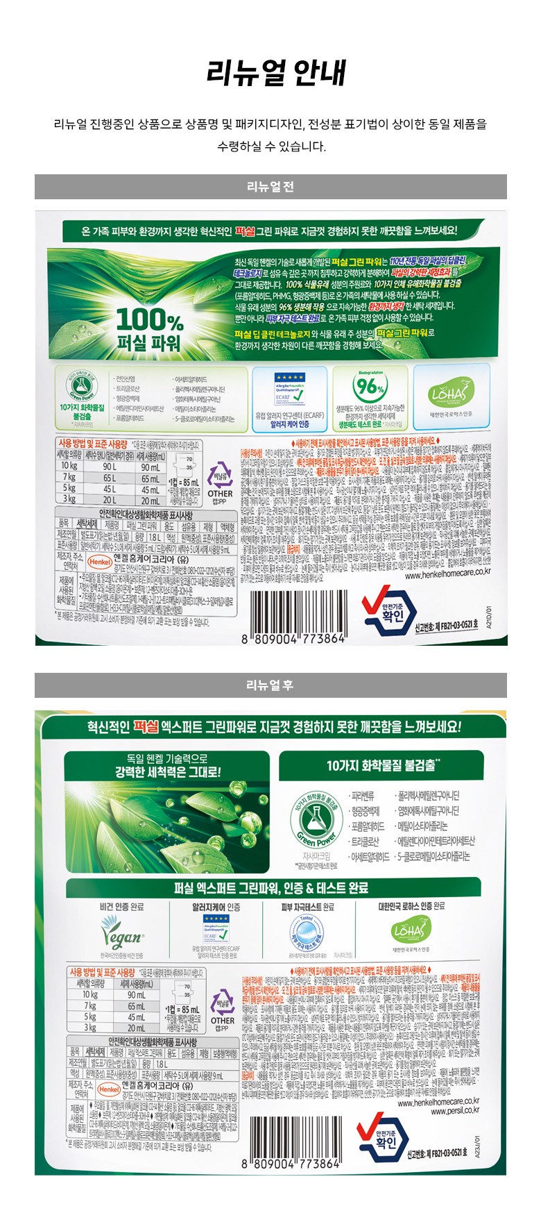 | 품목 및 제품명 | 리뉴얼 전: 세탁세제 / 퍼실 그린 파워 Ι 리뉴얼 후: 세탁세제 / 퍼실 엑스퍼트 그린 파워 | 용도(표백제의 경우 계열을 함께표시) 및 제형 | 리뉴얼 전: 섬유용 / 액체형 Ι 리뉴얼 후: 섬유용 / 보충형(액체형) |