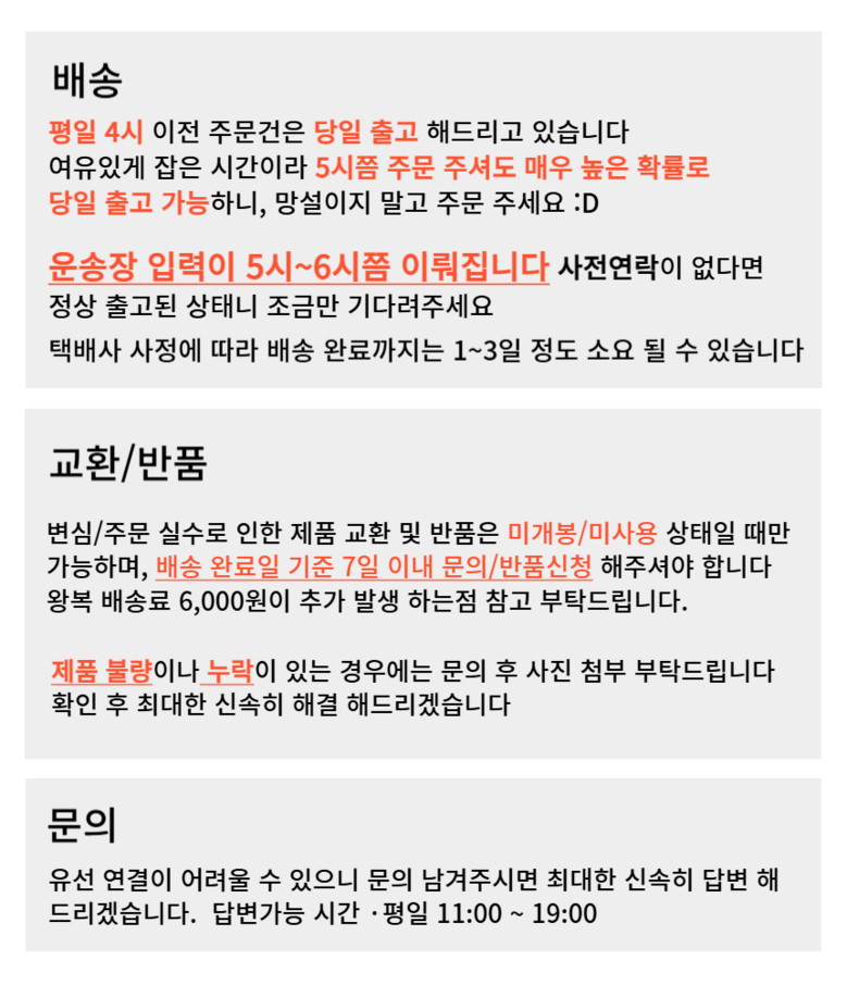 | 교환/반품 비용 (왕복비용) | 6,000원 - 단, 고객 변심의 경우에만 발생 - 도서산간 및 일부 지역 추가비용 발생 |