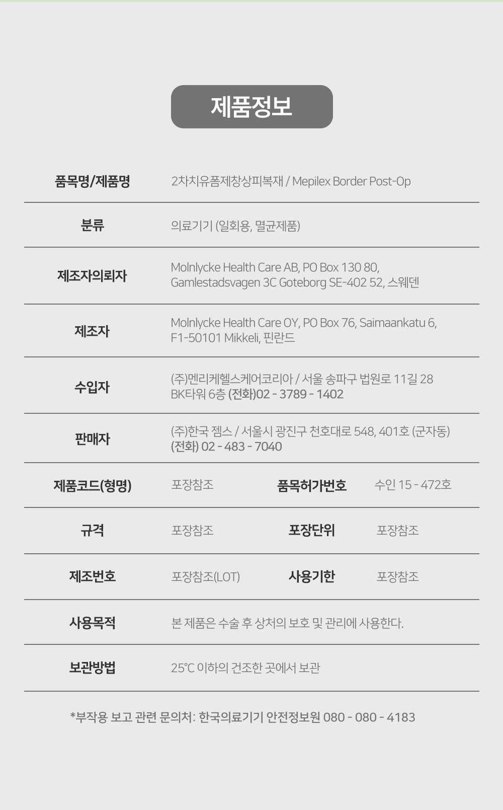 | 품명 및 모델명 | 점착성 투명 창상피복재 / 496100 | 허가∙인증∙신고번호 (의료기기법에 따른 허가∙인증∙신고 대상 의료기기에 한함) | 품목허가번호 : 수인 15-472 호 |