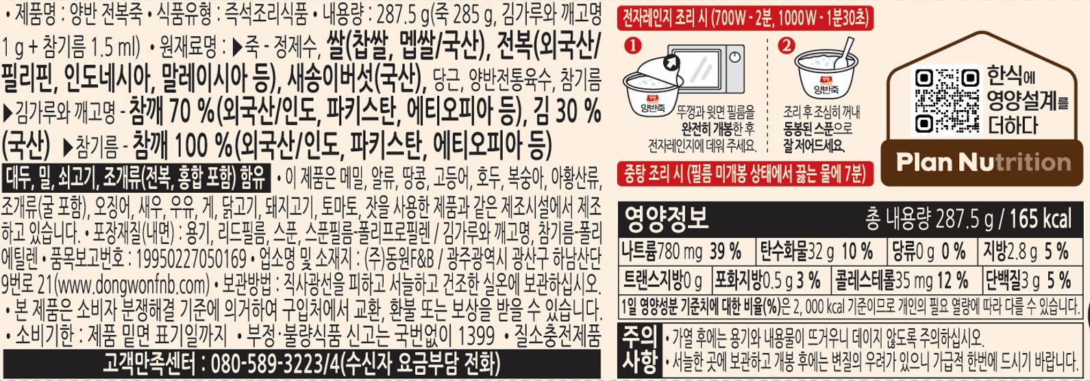 - 제품 주문선택: 동원 양반죽(소고기죽 6개+전복죽 6개)용기_12개