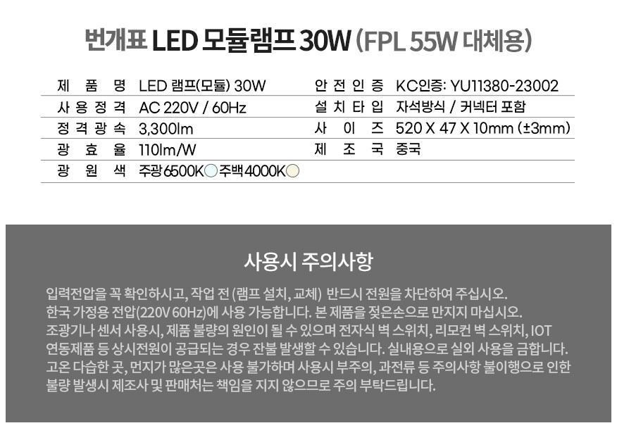 | 품명 및 모델명 | 번개표 LED 모듈 리폼형 램프 자석 30W 대체용 FPL 55W / KR3065-515N | KC 인증정보 | R-R-ksN-KR3065-515, YU11380-23002 |