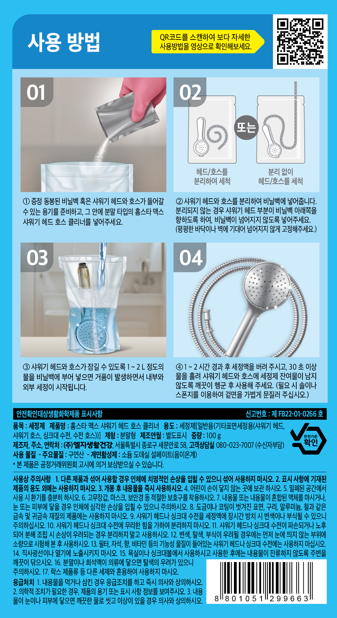 | 품목 및 제품명 | 세정제 / 홈스타 맥스 샤워기 헤드 호스 클리너 | 용도(표백제의 경우 계열을 함께표시) 및 제형 | 일반용(기타표면세정용(샤워기 헤드, 샤워기 호스, 싱크대 수전, 수전 호스) / 비분사형-분말형 |