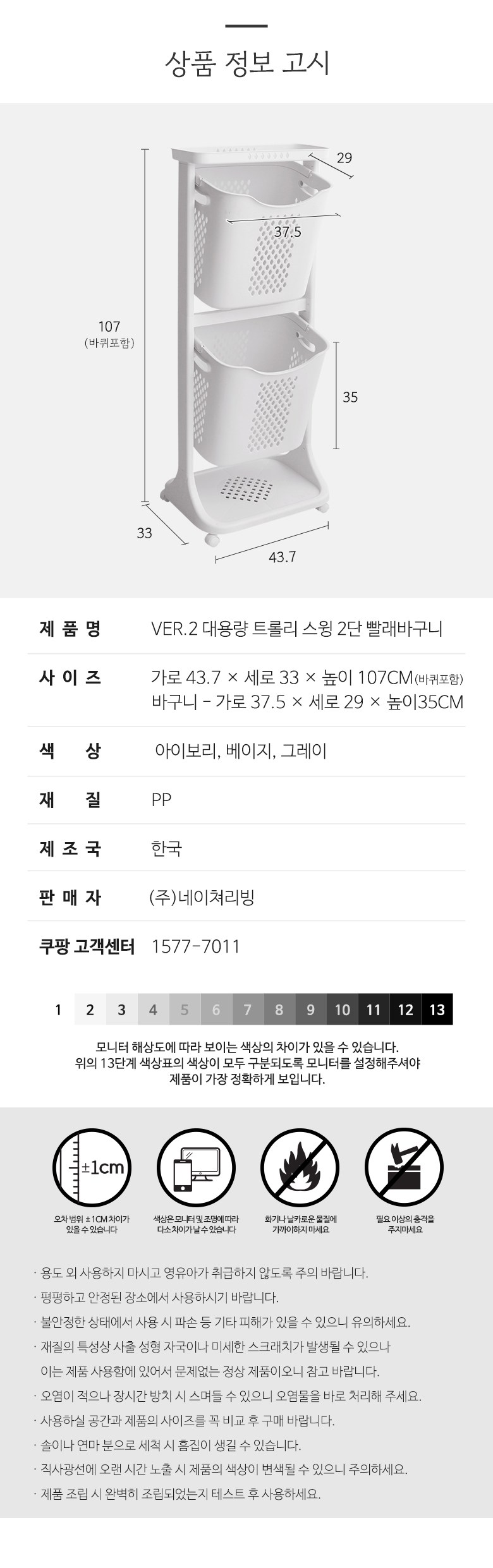 | 품명 및 모델명 | VER.2 대용량 트롤리 스윙 2단 빨래바구니_화이트 | 인증/허가 사항 | 해당없음(14세 이상) |