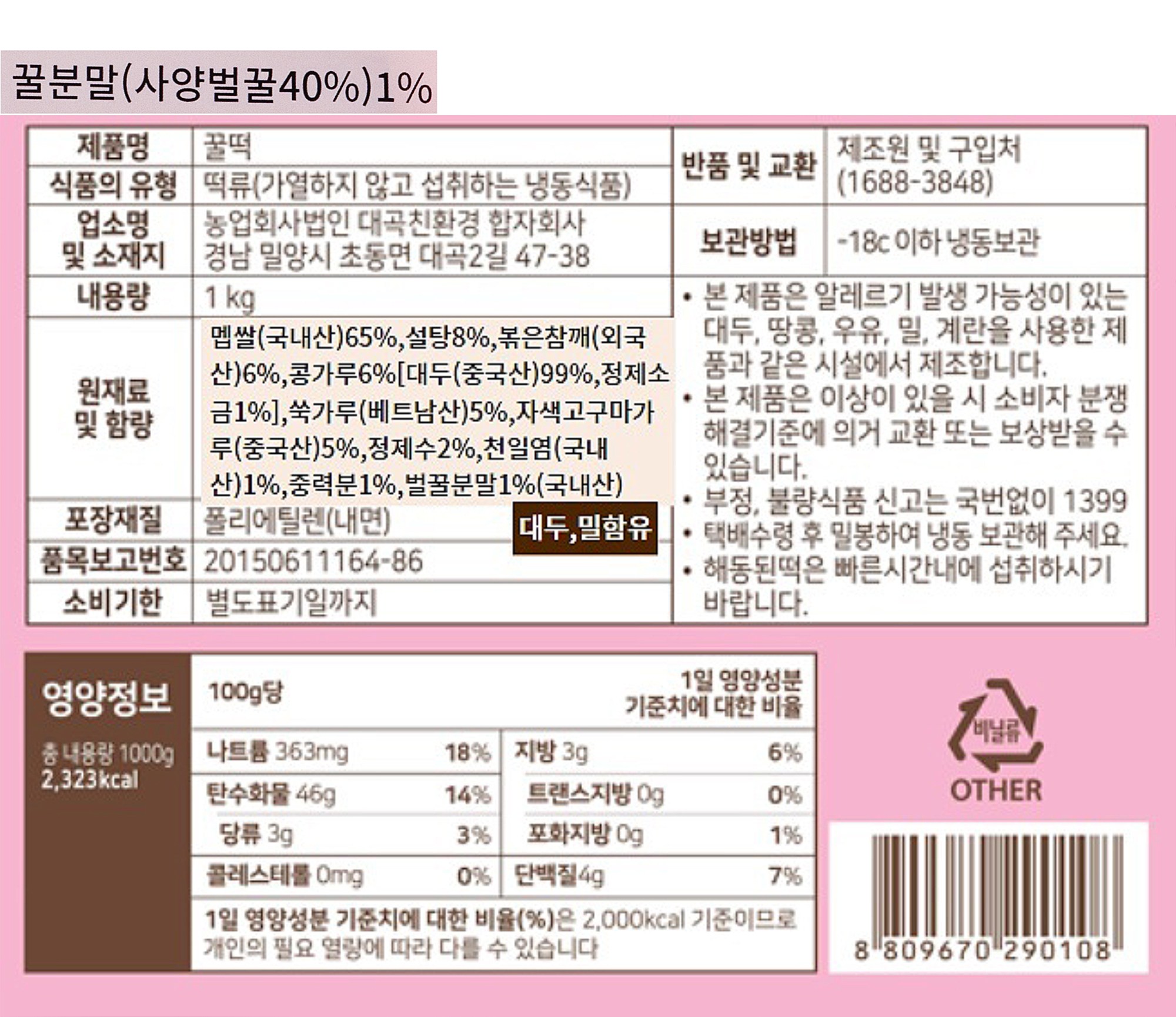 | 포장단위별 내용물의 용량(중량), 수량 | 1kg x 2개 | 원재료명 및 함량 | 컨텐츠 참조 |