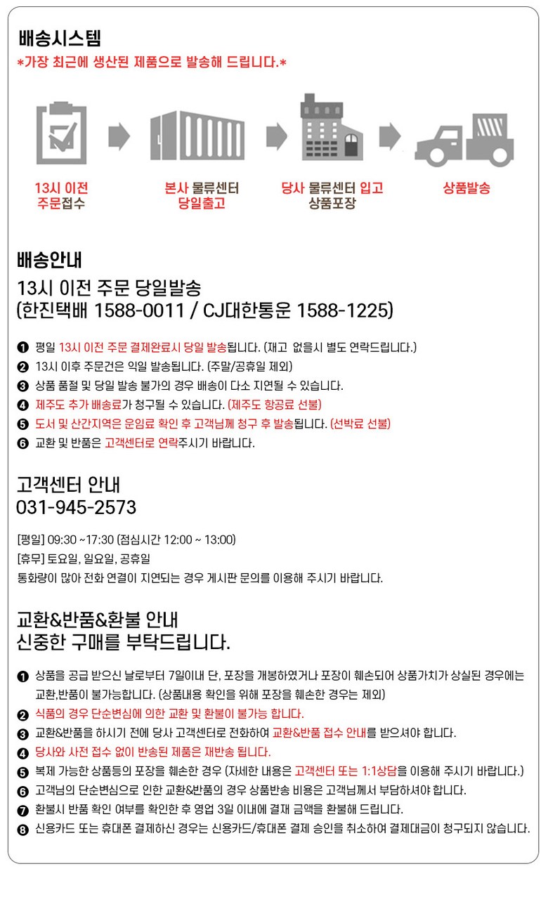 - ㆍ교환/반품에 관한 일반적인 사항은 판매자가 제시사항보다 관계법령이 우선합니다.
