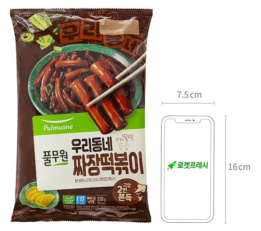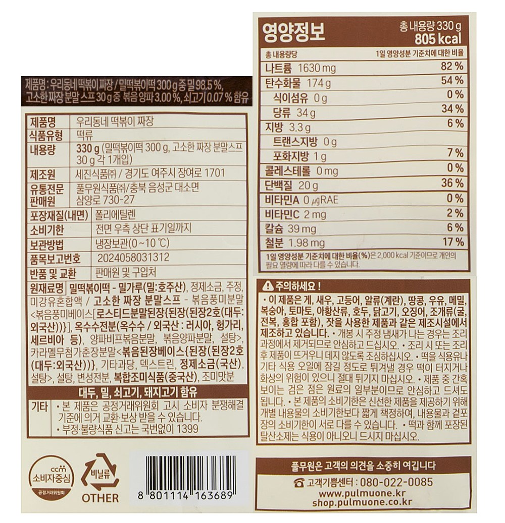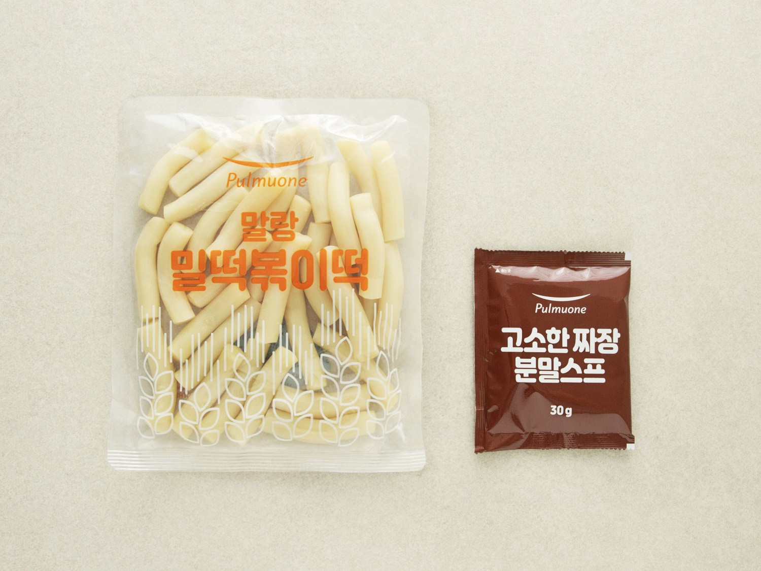 밀 떡볶이 떡, 고소한 짜장 분말스프로 구성되어 있습니다.