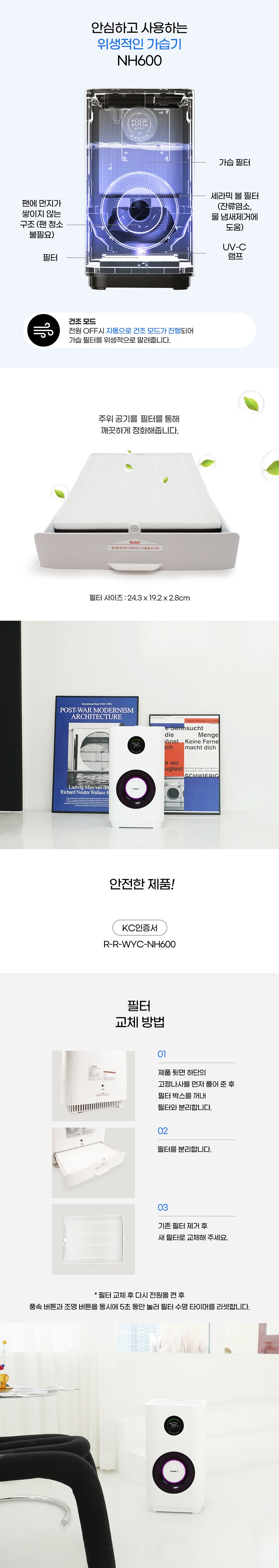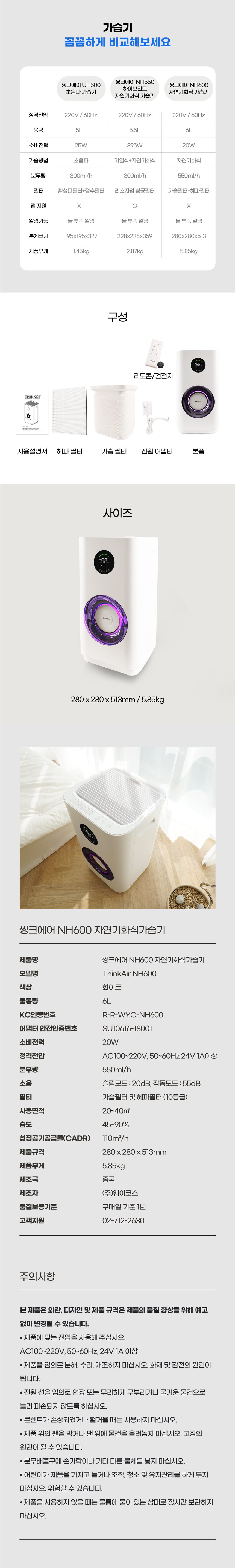 | 품명 및 모델명 | 씽크에어 자연기화식 가습기 | KC 인증정보 | 본품: R-R-WYC-NH600 / 어댑터: SU10616-18001 |