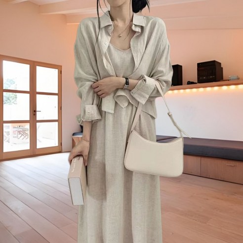 데일리 린넨 셔츠 끈나시 원피스 투피스 빈티지 봄여름 캐주얼 블라우스 세트