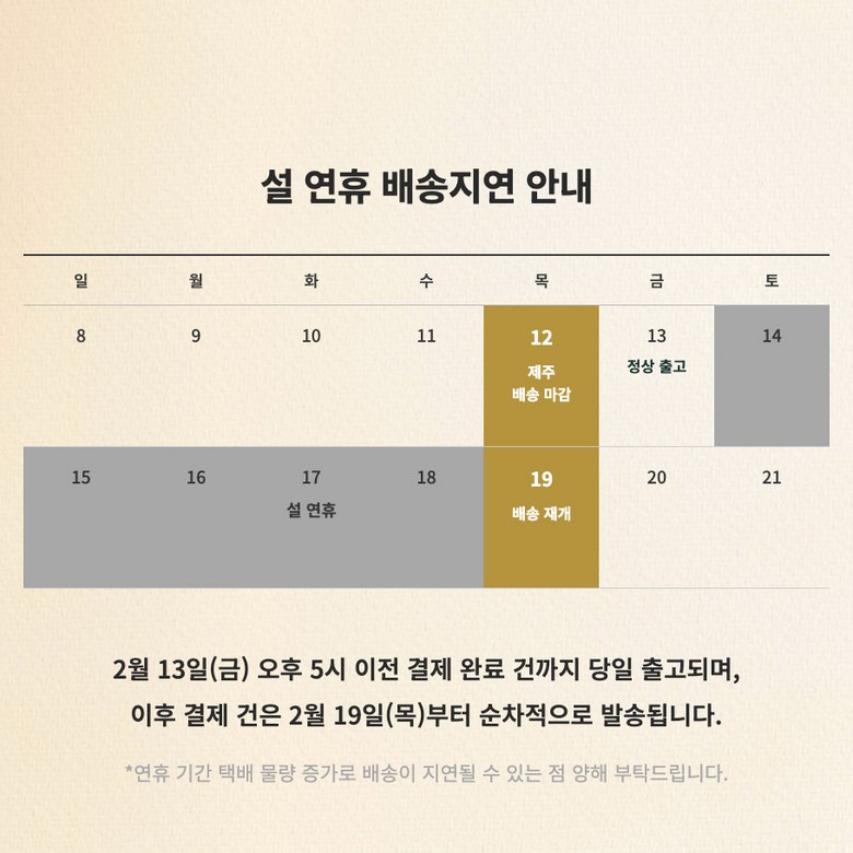| 배송기간 | ㆍ도서산간 지역 등은 배송에 3-5일이 더 소요될 수 있습니다. - 천재지변, 물량 수급 변동 등 예외적인 사유 발생 시, 다소 지연될 수 있는 점 양해 부탁드립니다. | ||