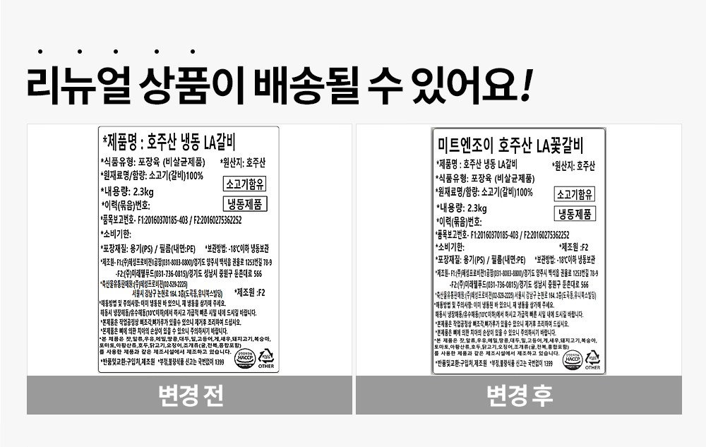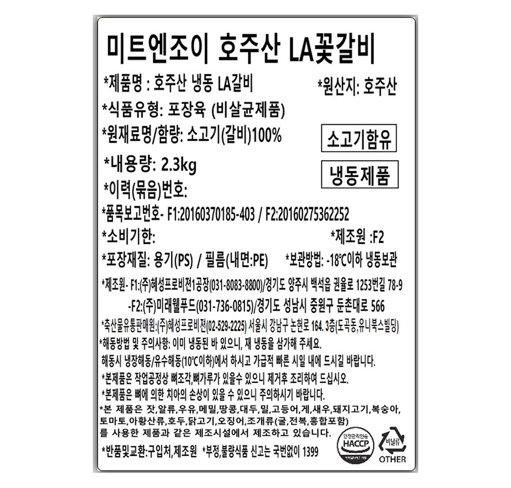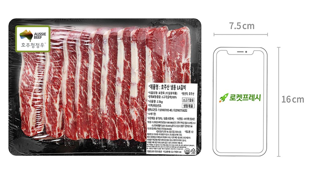 | 품목 또는 명칭 | 호주산 냉동 LA갈비 | 포장단위별 내용물의 용량(중량),수량,크기 | 2.3kg x 2개 |