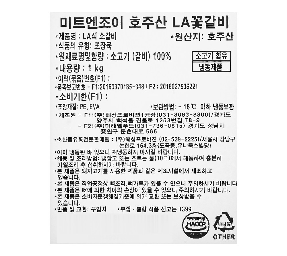 | 제조연월일, 소비기한 또는 품질유지기한 | 소비기한(또는 유통기한) : 2027년 01월 27일 이거나 그 이후인 상품 제조년월일 : 2026년 01월 28일 이후인 제조상품 | 세부 품목군별 표시사항 | 축산물 등급표시 : 해당 없음 / 이력번호 표시유무 : 이력번호 표시제품임 |