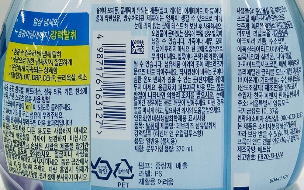 | 품목 및 제품명 | 탈취제 / 페브리즈 섬유탈취제 강력탈취 (라벤더 앤 유칼립투스향) | 용도(표백제의 경우 계열을 함께표시) 및 제형 | 일반용(물체용)/분무기형 |