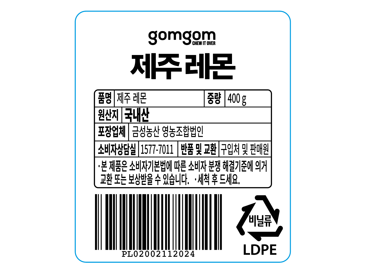 | 품목 또는 명칭 | 제주 레몬 | 포장단위별 내용물의 용량(중량),수량,크기 | 400g, 1개 |