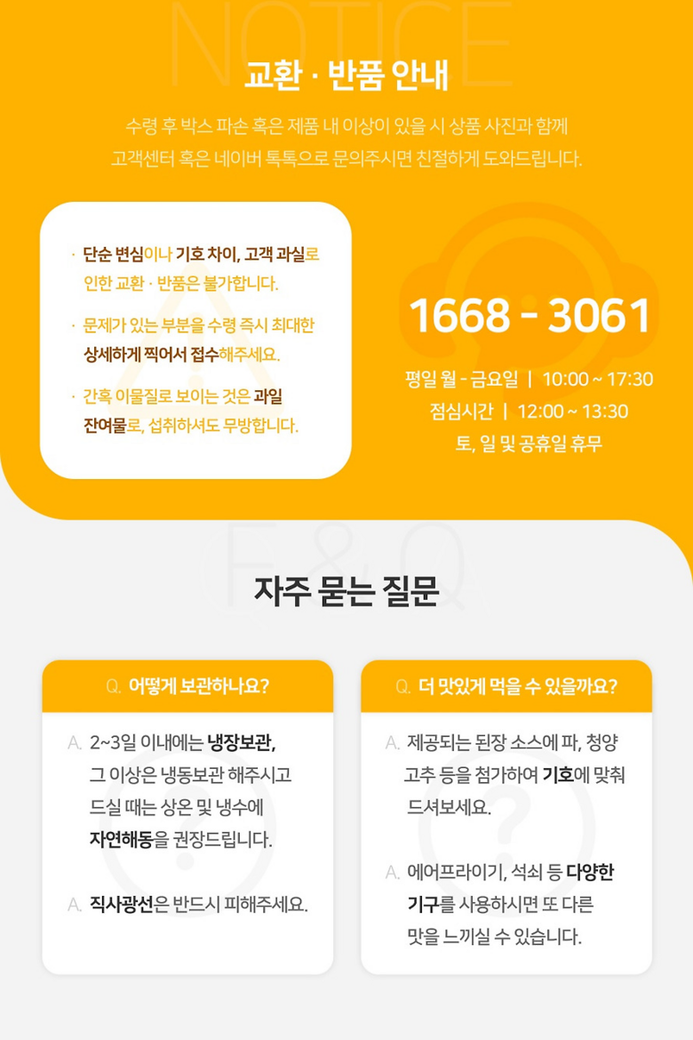 - 상품문의 및 후기게시판을 통해 취소나 환불, 반품 등은 처리되지 않습니다.