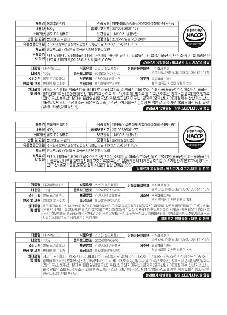 상호/대표자 | 주식회사 봉이 / 구자문 | 사업장 소재지 | 경상북도 안동시 풍산읍 유통단지길 163-3 주식회사 봉이 |