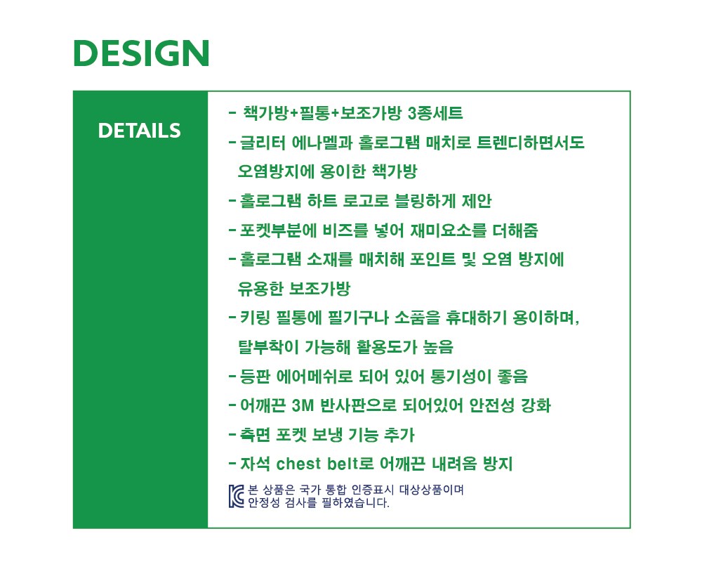 | 크기 | 책가방 : 270*370*115mm / 신주머니 : 310*330*80mm / 필통195*85*40mm | 중량 | 930g |