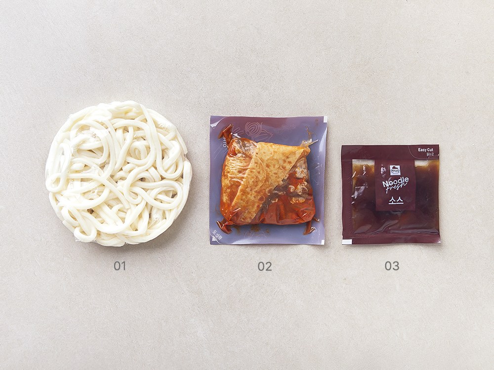 1. 포장지를 제거한 냉동상태의 우동면과 김치 고명을 준비해주세요.
