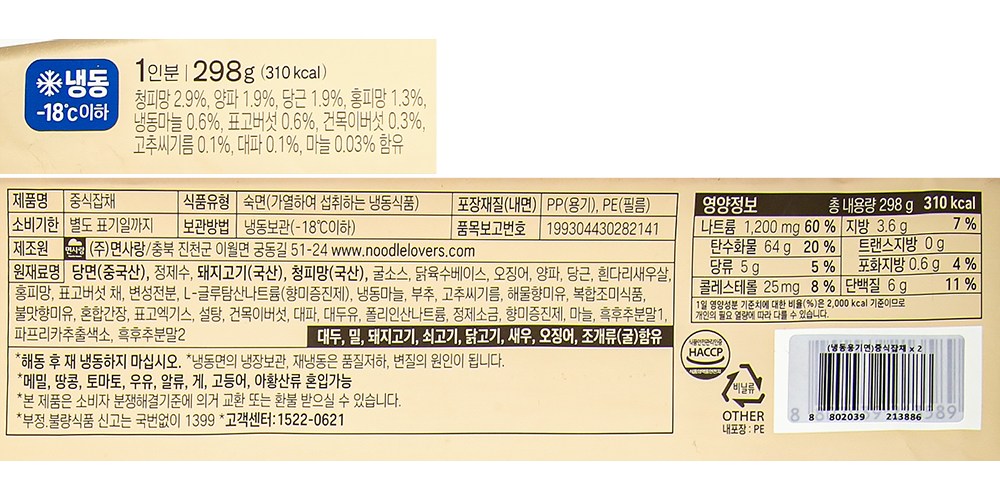 당면, 소스, 돼지고기, 청피망, 오징어, 양파, 당근, 흰다리새우살, 홍피망, 표고버섯 채, 건목이버섯 등으로 구성되어 있습니다.