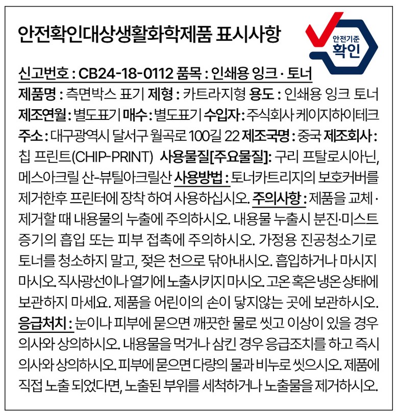 | 품목 및 제품명 | TN-2380 | 용도(표백제의 경우 계열을 함께표시) 및 제형 | 인쇄용토너 |