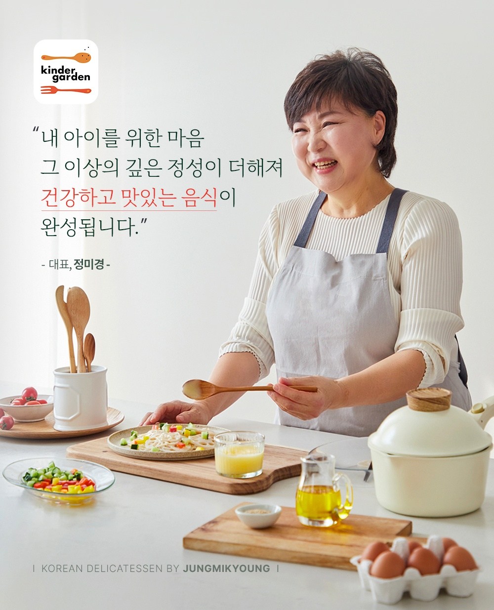 정미경키친의 아이 반찬 전문 브랜드 ‘킨더가든’은 음식에 따뜻한 마음과 정성을 가득 담습니다. 정미경 요리연구가의 내공과 노하우로 아이들의 균형 잡힌 식습관을 위한 반찬을 선보이죠. 아이가 직접 먹는 음식인 만큼 신선하고 좋은 재료만을 엄선하는 것은 물론, 정성스러운 조리 과정을 거쳐 안심하고 즐길 수 있어요. 아이들의 눈과 입맛에 꼭 맞추어 다채로운 색감과 귀여운 모양으로 세심하게 만들었으니, 킨더가든과 함께 즐거운 식사 시간을 만들어 보세요.
