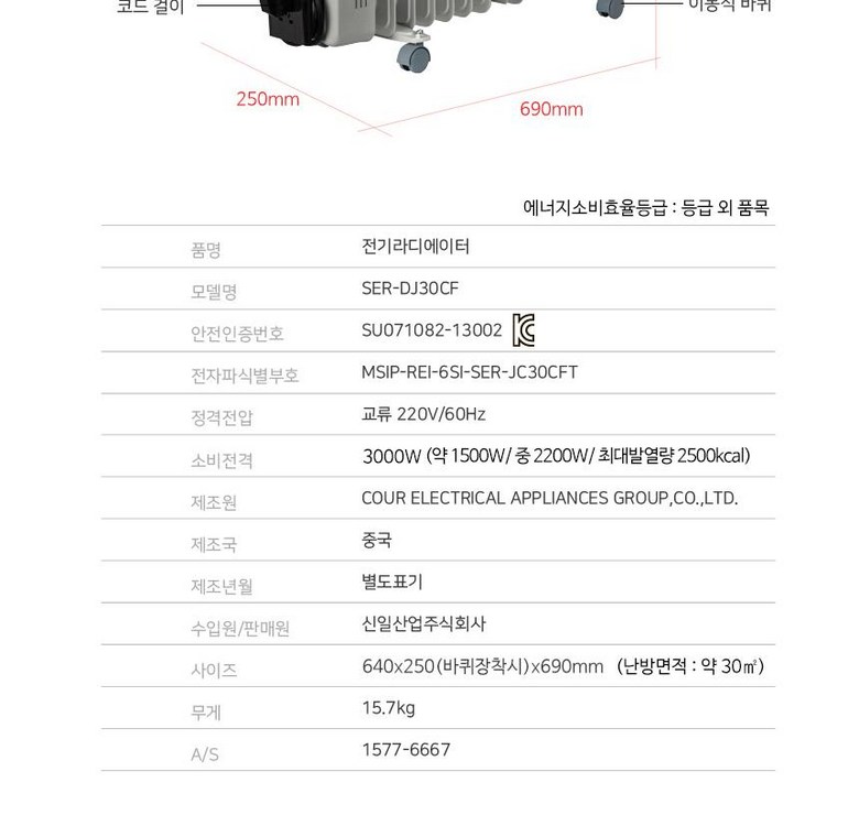 | 품명 및 모델명 | 라디에이터 SER-DJ30CF | KC 인증정보 | SU071082-10004 |