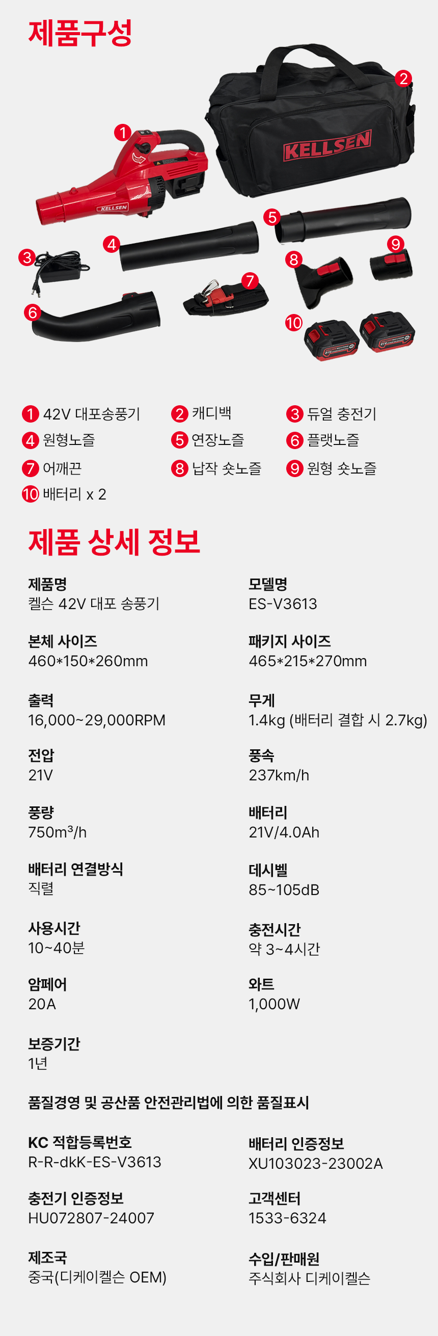 | 품명 및 모델명 | 대포 송풍기 / ES-V3613 | KC 인증정보 | 본품: R-R-dkK-ES-V3613, 전지: ZU101425-25002, 충전기: HU072807-24007, R-R-1Cb-HC252-2521000 |