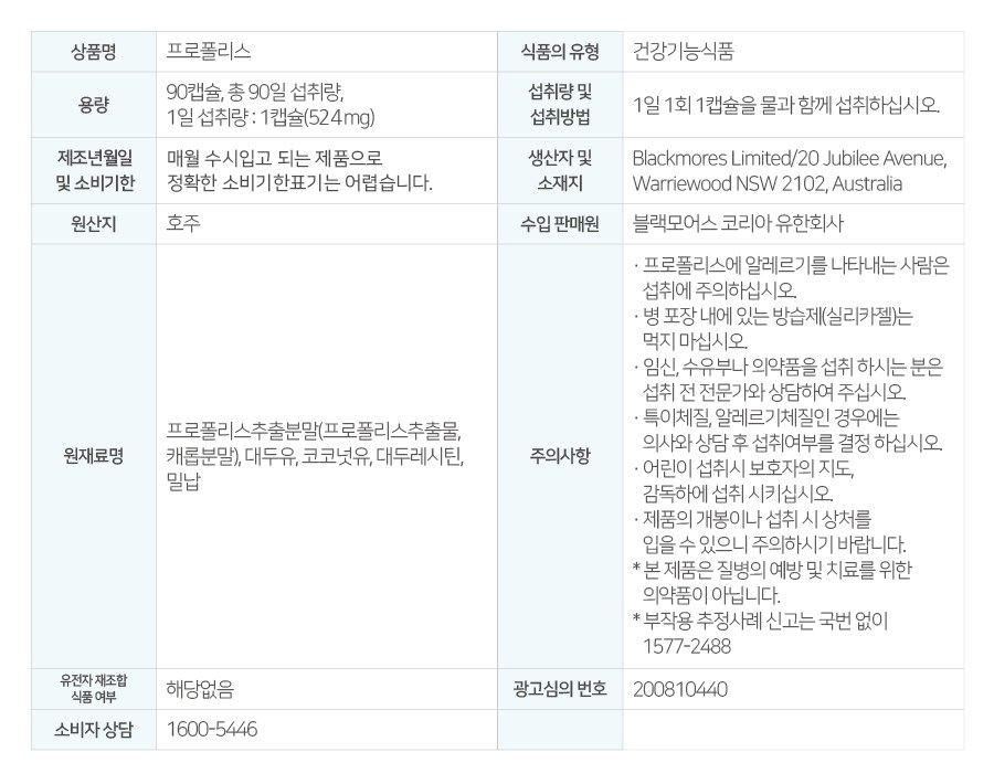 | 제품명 | 블랙모어스 프로폴리스 | 제조업소의 명칭과 소재지 | 컨텐츠 참조 |