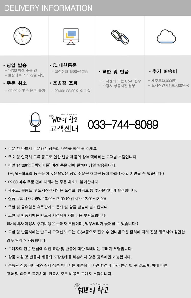 | 배송기간 | ㆍ도서산간 지역 등은 배송에 3-5일이 더 소요될 수 있습니다. - 천재지변, 물량 수급 변동 등 예외적인 사유 발생 시, 다소 지연될 수 있는 점 양해 부탁드립니다. | ||