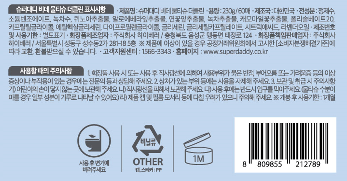 | 화장품제조업자, 화장품책임판매업자 및 맞춤형화장품판매업자 | 리뉴얼 전: 중원주식회사 / 중원주식회사 // 리뉴얼 후: 주식회사 하이베러 / 주식회사 하이베러 | 제조국 | 대한민국 |
