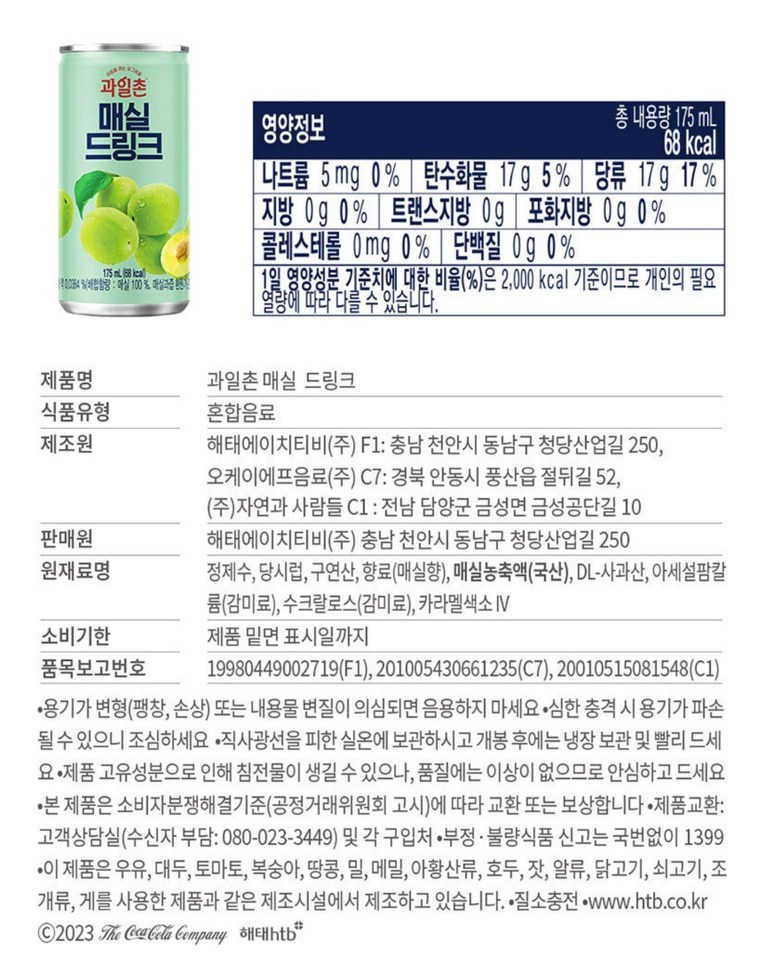 | 생산자 및 소재지 | 상품 상세페이지 참조 | 제조연월일, 소비기한 또는 품질유지기한 | 상품 상세페이지 참조 |