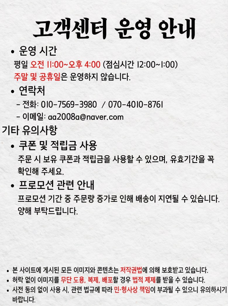 - 상품문의 및 후기게시판을 통해 취소나 환불, 반품 등은 처리되지 않습니다.