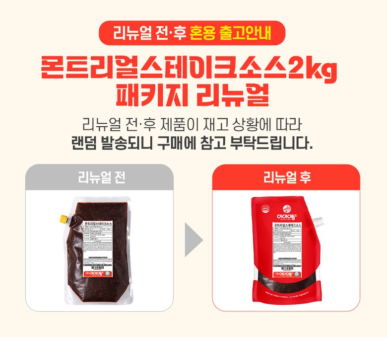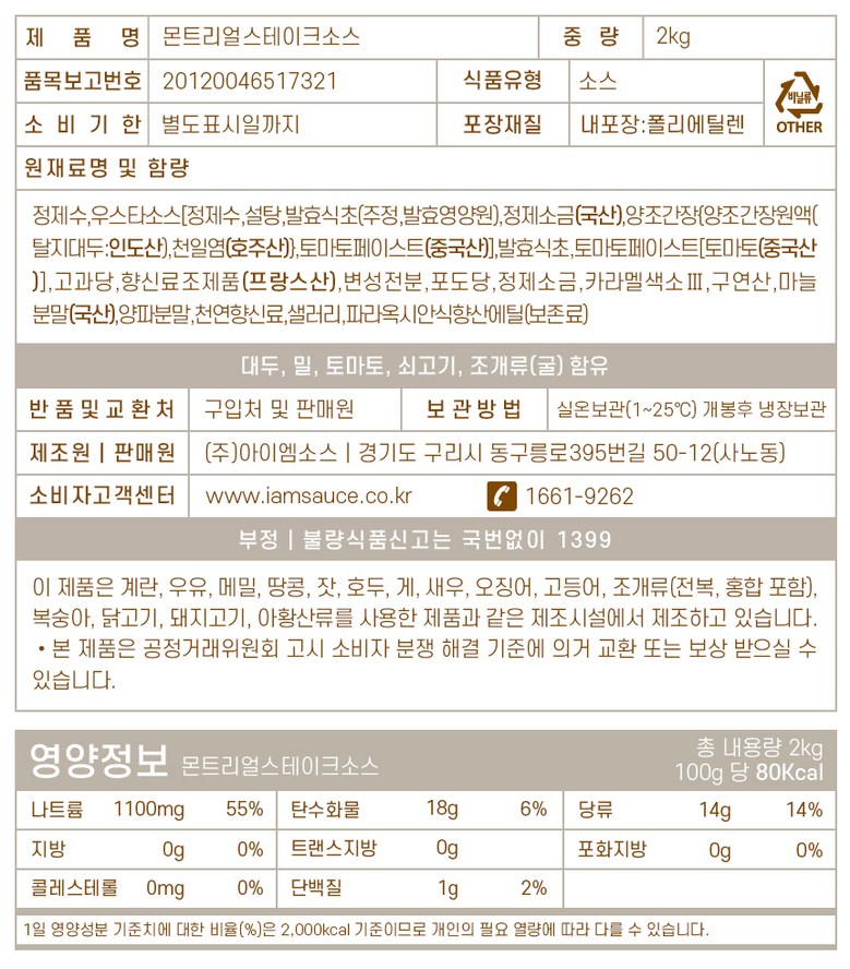 | 포장단위별 내용물의 용량(중량), 수량 | 2kg / 1ea | 원재료명 및 함량 | 정제수,우스타소스[정제수,설탕,발효식초(주정,발효영양원),정제소금(국산),양조간장{양조간장원액(탈지대두:인도산),천일염(호주산)},토마토페이스트(중국산)],발효식초,토마토페이스트[토마토(중국산)],고과당,향신료조제품(프랑스산),변성전분,포도당,정제소금,카라멜색소Ⅲ,구연산,마늘분말(국산),양파분말,천연향신료,샐러리,파라옥시안식향산에틸(보존료) |