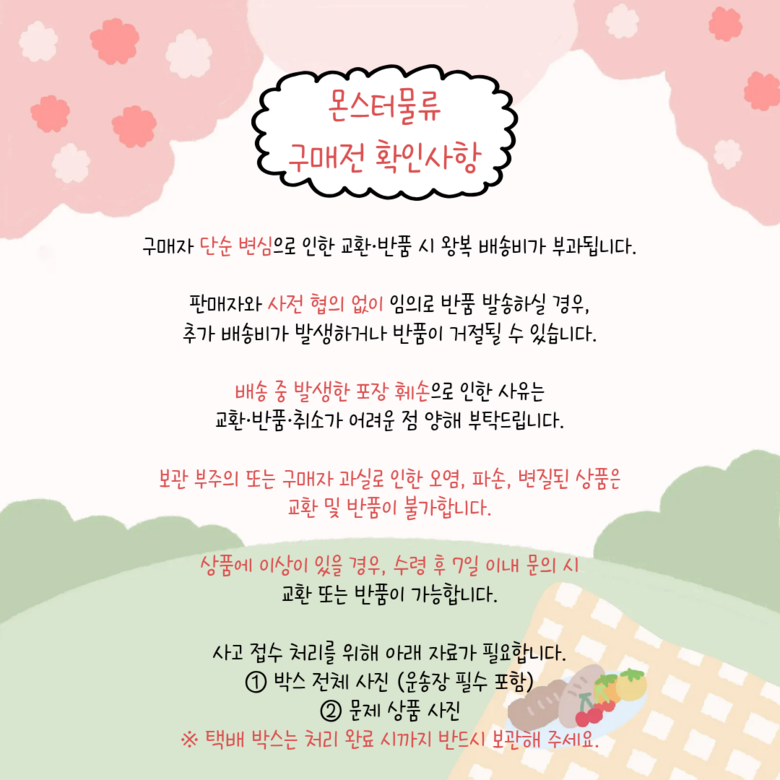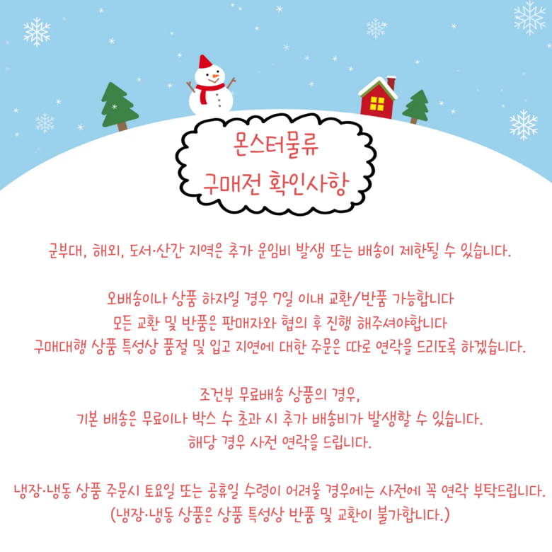- ㆍ모니터 해상도의 차이로 인해 색상이나 이미지가 실제와 달라, 고객이 단순 변심으로 교환/반품을 무료로 요청하는 경우