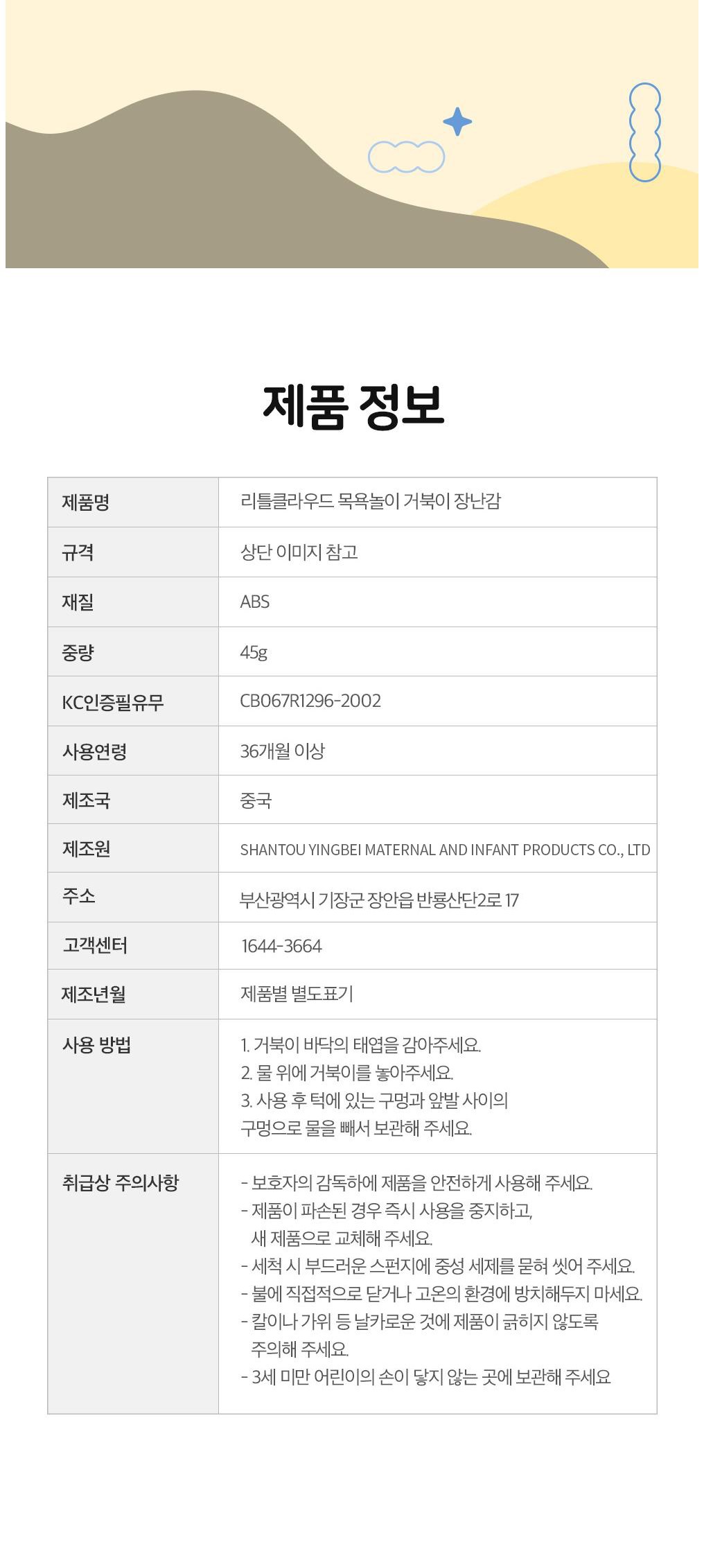 | 품명 및 모델명 | 리틀클라우드 유아용 목욕놀이 거북이 장난감 3종 세트 | KC 인증정보 | CB067R1296-2002 |