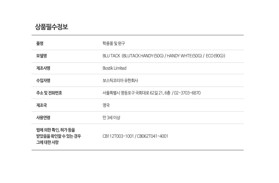 | 품명 및 모델명 | 보스틱 블루택 오리지널 화이트 50g | KC 인증정보 | CB062T041-4001, CB112T003-1001 |