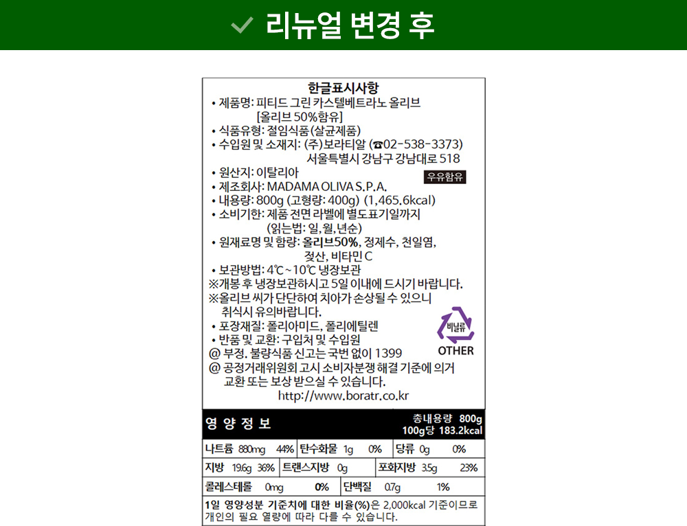 일일이 손질하는 번거로움 없이 간편하게 즐기는 카스텔베트라노 그린 올리브예요. 한입 쏙 먹어보면 아삭하면서도 부드러운 식감이 느껴지죠. 씹을수록 은은하게 퍼지는 고소함까지 함께 음미해보세요. 수제 햄, 치즈와 곁들이면 근사한 와인 안주가 완성된답니다.