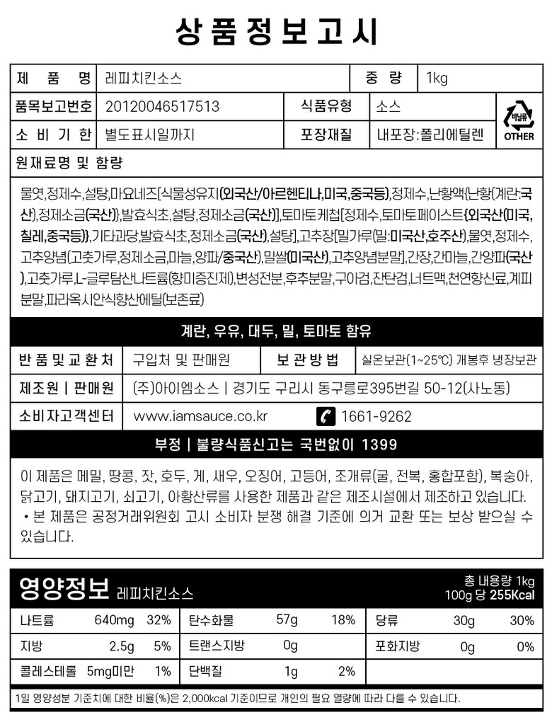 | 제품명 | 레피치킨소스 | 식품의 유형 | 소스 |