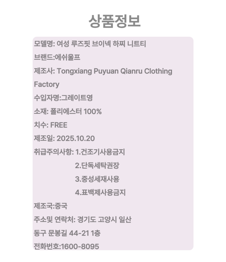 | 소비자상담 및 교환반품 문의 | 쿠팡고객센터 1577-7011 배송 및 환불/교환에 대한 문의는 마이쿠팡-고객센터 내 상담하기를 이용해주세요. | ||