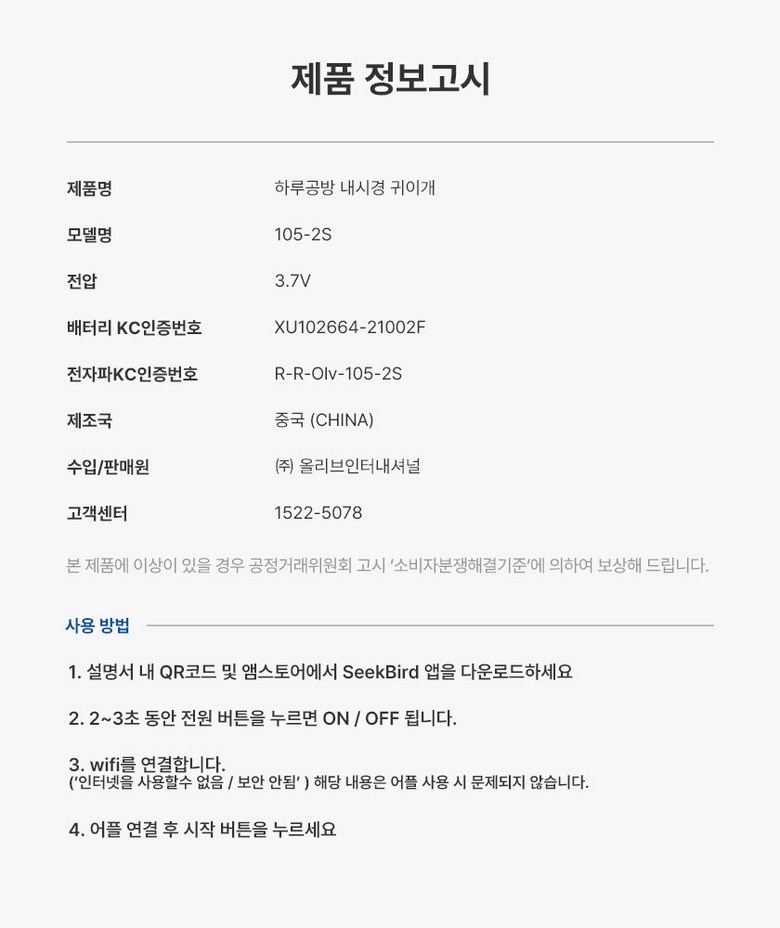 | 소비자상담 및 교환반품 문의 | 쿠팡고객센터 1577-7011 배송 및 환불/교환에 대한 문의는 마이쿠팡-고객센터 내 상담하기를 이용해주세요. | ||