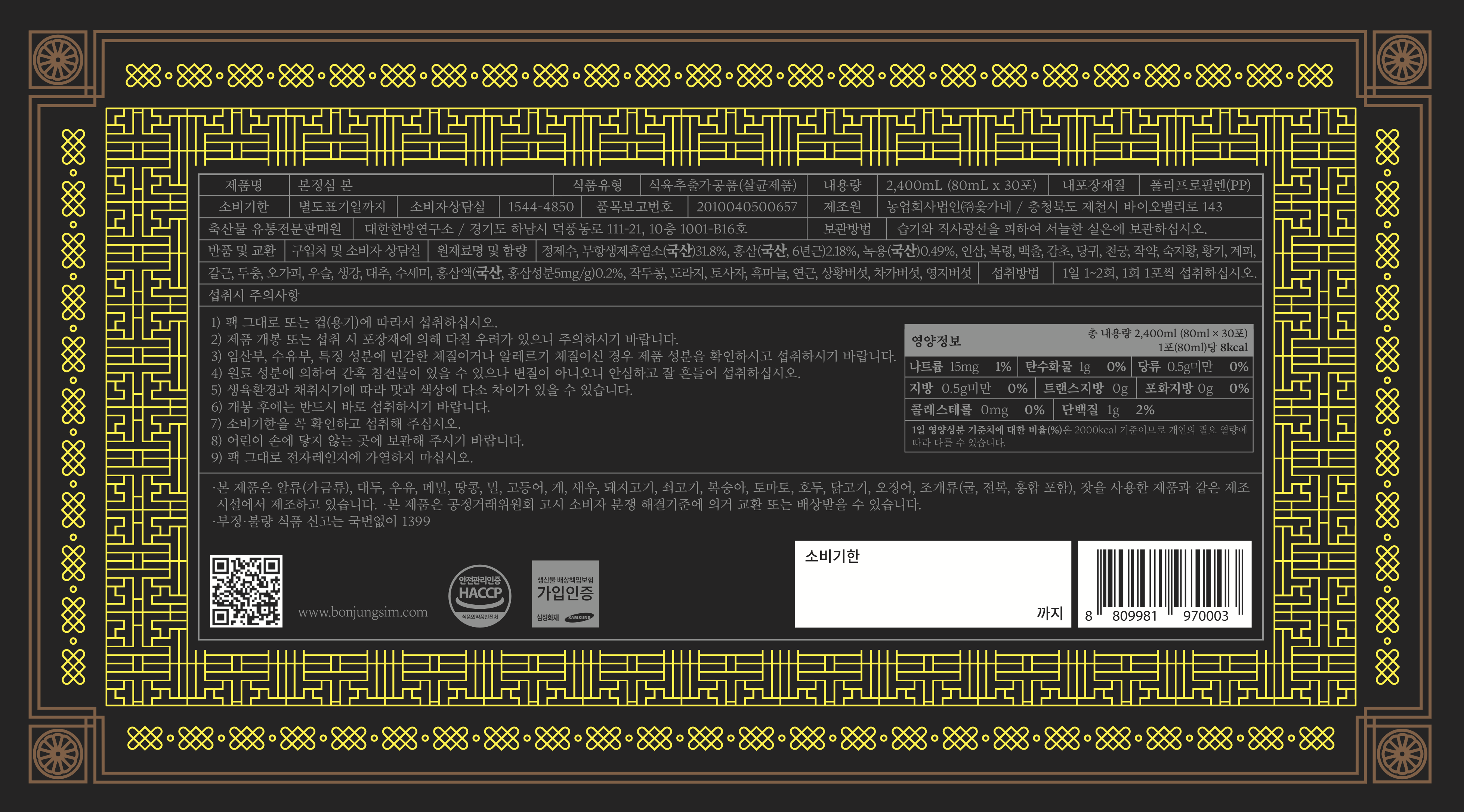 | 생산자 및 소재지 | 컨텐츠 참조 | 제조연월일, 소비기한 또는 품질유지기한 | 소비기한(또는 유통기한) : 2026년 12월 19일 이거나 그 이후인 상품 제조년월일 : 2024년 12월 20일 이후인 제조상품 |