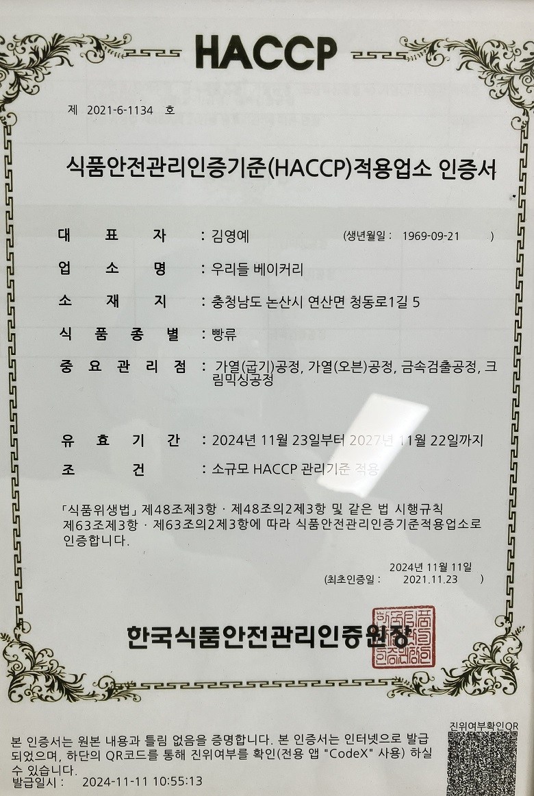 상호/대표자 | 우리들베이커리 / 김영예 | 사업장 소재지 | 충청남도 논산시 연산면 청동로1길 5 우리들베이커리 |