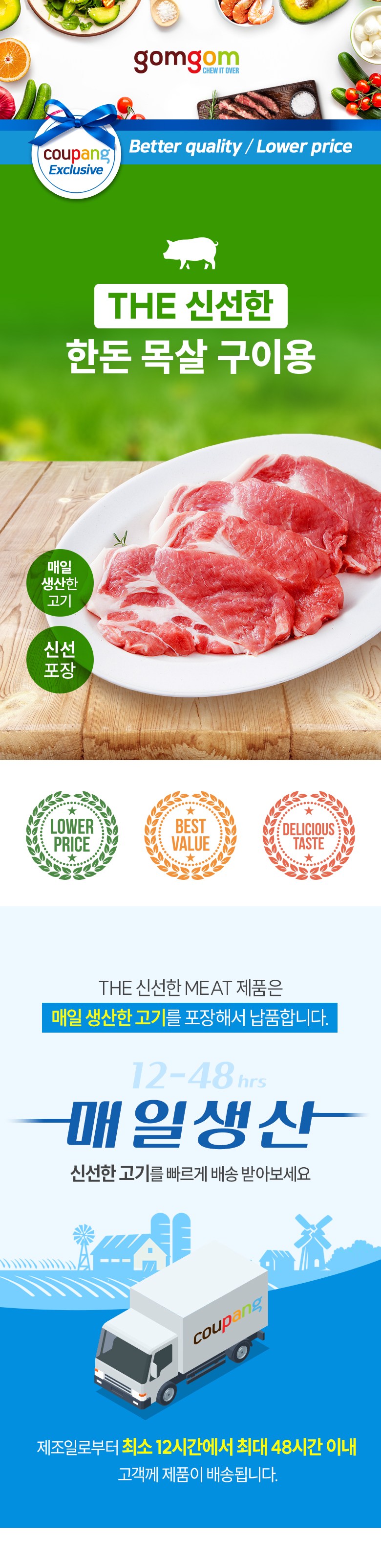 | 품목 또는 명칭 | THE 신선한 한돈 목살 구이용 | 포장단위별 내용물의 용량(중량),수량,크기 | 500g |