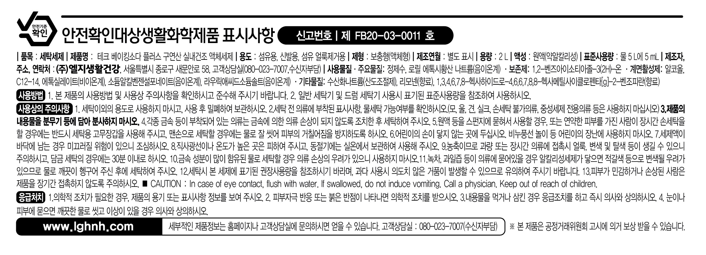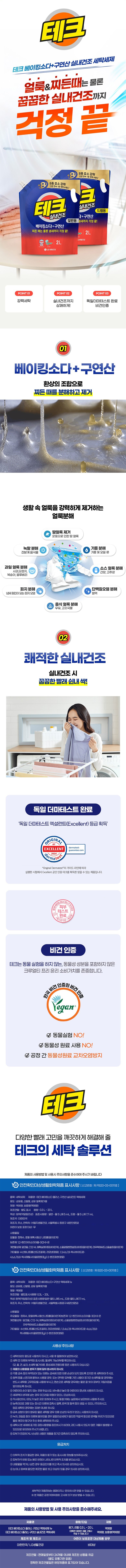 | 품목 및 제품명 | 세탁세제 / 테크 베이킹소다 플러스 구연산 실내건조 액체세제 | 용도(표백제의 경우 계열을 함께표시) 및 제형 | 섬유 얼룩제거용,신발용,섬유용 / 보충형(액체형) |
