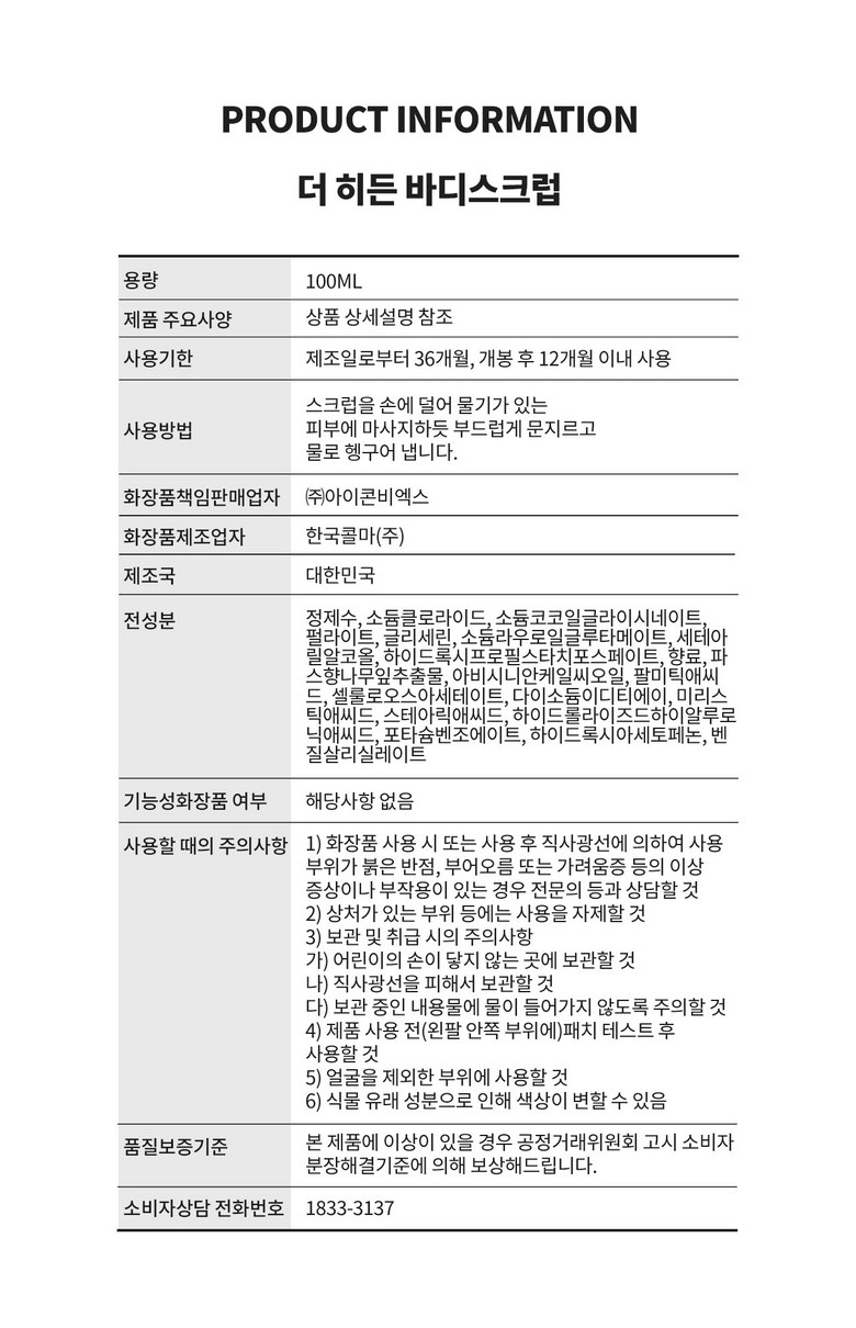| 화장품제조업자, 화장품책임판매업자 및 맞춤형화장품판매업자 | 화장품제조업자 : 한국콜마(주) /화장품책임판매업자 : ㈜아이콘비엑스 | 제조국 | 대한민국 |