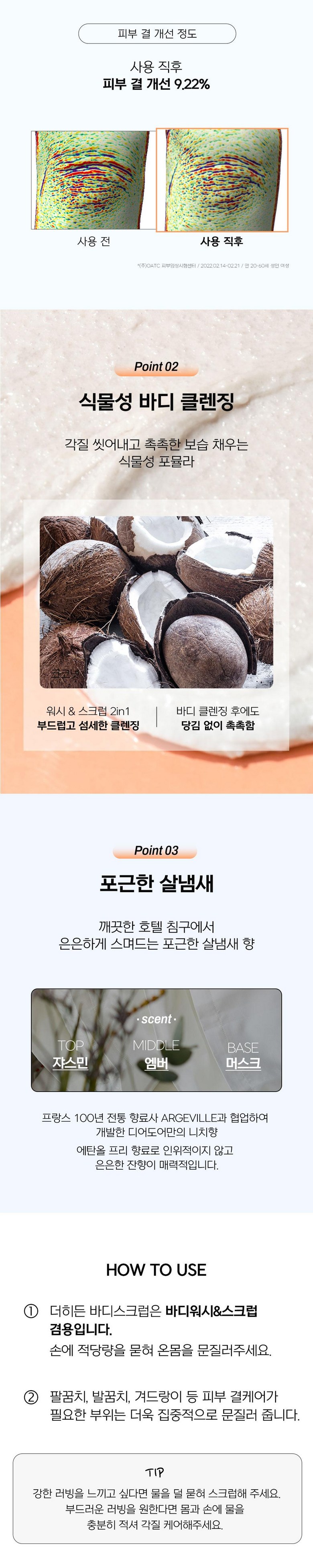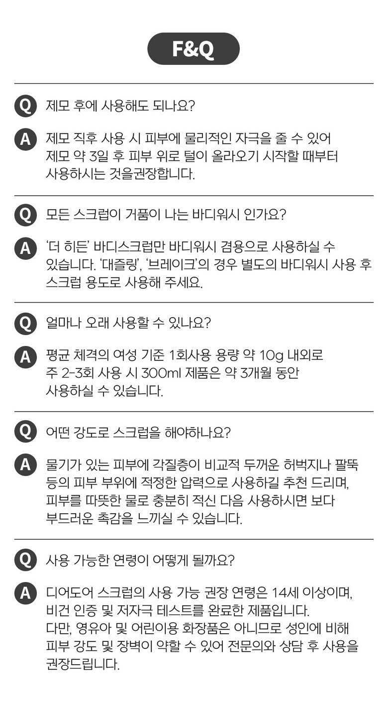 | 사용기한 또는 개봉 후 사용기간 | 제조일로부터 36개월, 개봉 후 12개월 이내 사용 | 사용방법 | 동봉된 스패출러를 이용해 스크럽을 손에 덜어 물기가 있는 피부에 마사지하듯 부드럽게 문지르고 물로 헹구어 냅니다. |