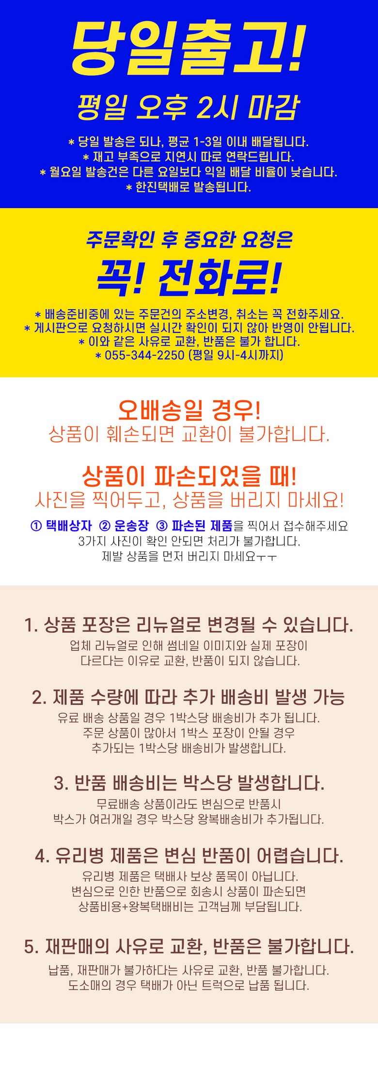 - ㆍ모니터 해상도의 차이로 인해 색상이나 이미지가 실제와 달라, 고객이 단순 변심으로 교환/반품을 무료로 요청하는 경우