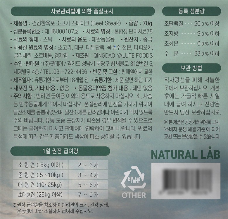 | 품명 및 모델명 | 건강한육포 소고기 스테이크 | 인증사항 | 사료관리법에 따른 성분등록번호 : 컨텐츠 참조 |